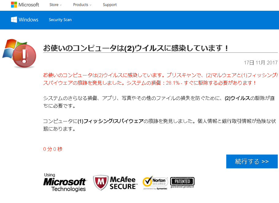 これは、偽の警告ページなので完全に無視しましょう。左上の✕をクリックし画面を閉じてしまって大丈夫です。OKや了解をクリックしてはいけません。windowsの場合右上、Macの場合左上の✕ボタンを必ず押すようにしてください。